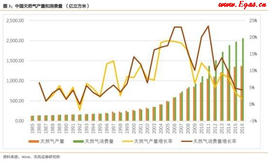 2016年中國天然氣消費(fèi)量2058億立方米,產(chǎn)量1368億立方米,供需缺口近700億立方米,對(duì)外依存度34%。自2014年起,中國天然氣的產(chǎn)量和消費(fèi)量增速均有所放緩,但消費(fèi)量的增速仍然持續(xù)大于產(chǎn)量的增速。隨著中國城鎮(zhèn)化過程中居民能源消費(fèi)結(jié)構(gòu)的變化,以及環(huán)保監(jiān)管日趨嚴(yán)格的背景下燃?xì)馓娲禾抗╇姽嵝枨蟮奶嵘烊粴庀掠蜗M(fèi)有進(jìn)一步增長的空間。開發(fā)國內(nèi)非常規(guī)天然氣、進(jìn)口管道氣、進(jìn)口LNG是解決中國天然氣供需缺口的三大主要途徑。