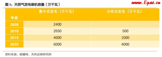 據(jù)中電聯(lián)的《"十三五"天然氣發(fā)電需求預(yù)測》,預(yù)計2020年我國天然氣發(fā)電規(guī)模1億千瓦,其中分布式4000萬千瓦。當(dāng)前我國天然氣分布式能源總裝機容量為500萬千瓦,缺口很大。假設(shè)9F聯(lián)合循環(huán)機組設(shè)備購置加安裝的平均費用為2500元每千瓦,到2020年,集中式天然氣發(fā)電新增市場規(guī)模將達(dá)500億元。假設(shè)天然氣分布式發(fā)電設(shè)備購置及安裝費用為3500元每千瓦,到2020年,分布式天然氣發(fā)電設(shè)備新增市場規(guī)模將超過1000億元。