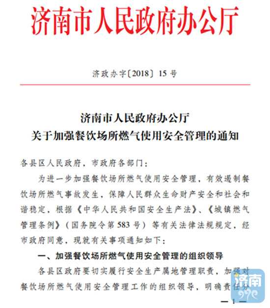 從濟(jì)南市安監(jiān)局獲悉,為進(jìn)一步加強(qiáng)餐飲場(chǎng)所燃?xì)馐褂冒踩芾?,有效遏制餐飲?chǎng)所燃?xì)馐鹿拾l(fā)生,保障人民群眾生命財(cái)產(chǎn)安全和社會(huì)和諧穩(wěn)定,濟(jì)南市政府辦公廳近日印發(fā)《關(guān)于加強(qiáng)餐飲場(chǎng)所燃?xì)馐褂冒踩芾淼耐ㄖ罚ㄒ韵潞?jiǎn)稱《通知》),明確要求各縣區(qū)每半年要至少開(kāi)展一次餐飲場(chǎng)所燃?xì)馐褂冒踩珜m?xiàng)整治活動(dòng)。