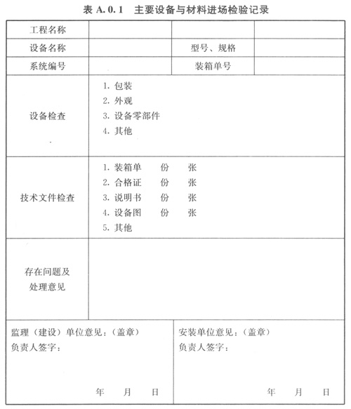 A.0.1主要設(shè)備與材料進(jìn)場(chǎng)檢驗(yàn)記錄可按表A.0.1的格式記錄。