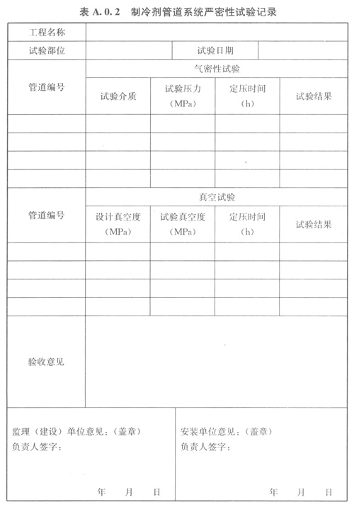 A.0.2制冷劑管道系統(tǒng)嚴(yán)密性試驗(yàn)記錄可按表A.0.2的格式記錄。