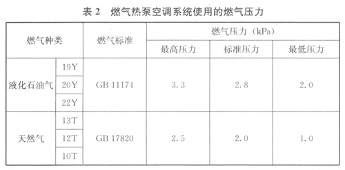 2.2.5現(xiàn)行國家標準《燃氣發(fā)動機驅(qū)動空調(diào)(熱泵)機組》GB/T 22069—2008中第6.1.2條規(guī)定了燃氣熱泵空調(diào)機組使用的燃氣壓力如表2所示。