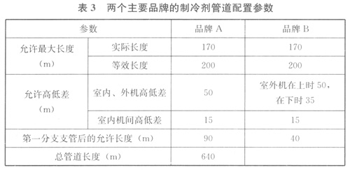 室內(nèi)、外機之間以及室內(nèi)機之間的最大管長與最大高差,是燃氣熱泵空調(diào)系統(tǒng)的重要性能參數(shù),為保證系統(tǒng)運行安全、穩(wěn)定、高效,在設(shè)計時,系統(tǒng)的最大管長與最大高差不應(yīng)超過所選用產(chǎn)品的技術(shù)要求。表3列出了兩個主要品牌的相關(guān)技術(shù)要求。