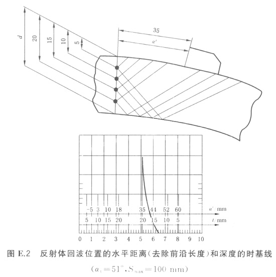 E5.1中闡述的時基線設置的原理在這里仍適用,但深度和水平距離不再是線性的。非線性標度比例的建立,可在聲程距離比例圖上通過一系列的位置來繪出,或由適當的公式計算出,或可從曲面試塊上得到一系列反射體的最高回波來確定標度,中間值可通過插值法獲得。見圖E.2。
