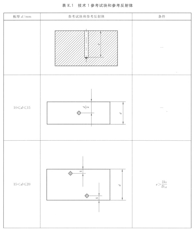 制作DAC曲線所使用的參考試塊,應具有一系列不同聲程距離的反射體,且試塊上反射體的深度應大于被檢工件的高度。表E.1詳細給出間距、試塊最小尺寸和反射體的具體要求。