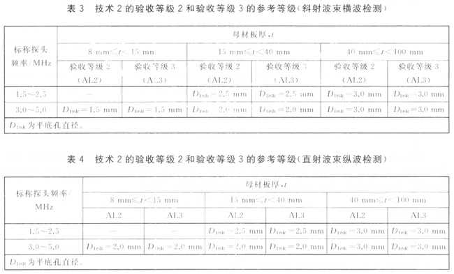b)技術(shù)2:以規(guī)定尺寸的平底孔(見表3和表4)作為基準(zhǔn)反射體的,制作縱波/橫渡距離-增益尺寸曲線(DGS)。