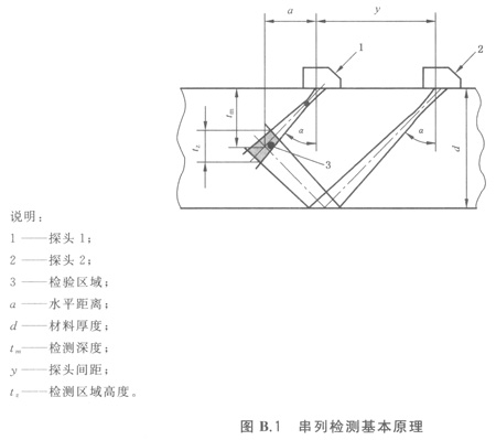 斜探頭間距(y)、聲束軸線交叉點(diǎn)檢測(cè)深度(tm)和檢測(cè)區(qū)域高度(tz)之間的關(guān)系見圖B.1。