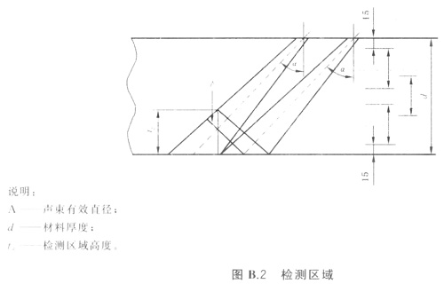 檢測(cè)區(qū)域高度(tz)可用參考試塊上不同深度反射體來測(cè)定,或用接近對(duì)面最大聲程結(jié)合聲束有效直徑來計(jì)算: