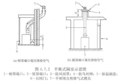 4.7.1當(dāng)半密閉自然排氣式燃具安裝部位臨近較高建筑或用氣建筑較高造成煙道過長無法安裝時,或用戶需要的燃具熱負荷大于35kW時,可設(shè)置平衡式隔室,并將半密閉自然排氣式燃具安裝在平衡式隔室內(nèi)。