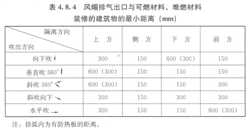 4.8.4建筑外墻燃具水平煙道風(fēng)帽排氣出口與可燃材料、難燃材料裝修的建筑物的最小距離應(yīng)符合表4.8.4的規(guī)定。