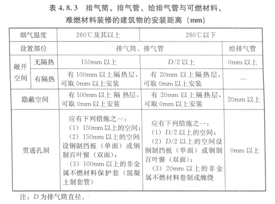 4.8.3排氣筒、排氣管、給排氣管與可燃材料、難燃材料裝修的建筑物的安裝距離應(yīng)符合表4.8.3的規(guī)定。