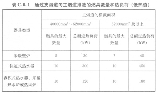 C.0.1主、支并列型共用煙道系統(tǒng)(圖C.0.1),主煙道橫截面積、燃具的最大數(shù)量和總額定熱負(fù)荷應(yīng)符合表C.0.1的規(guī)定。