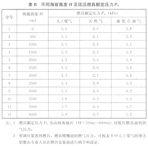 附錄B 不同海拔高度H及低壓燃具額定壓力Pn