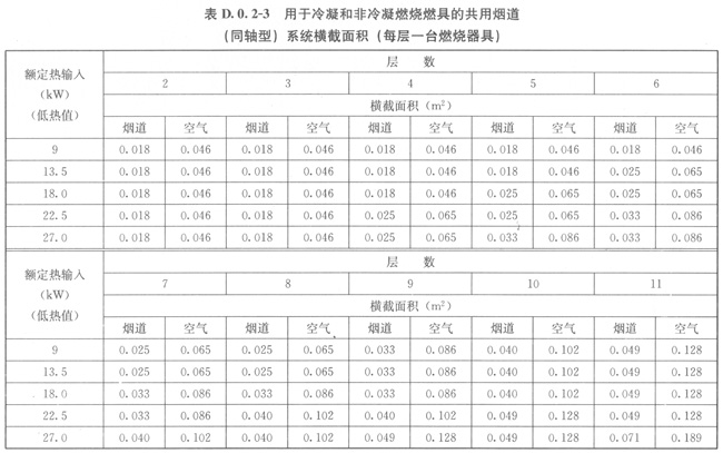 3當(dāng)每層設(shè)置1臺燃具時,同軸型煙道尺寸應(yīng)按表D.0.2-3的規(guī)定采用。