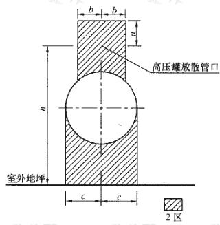 以儲罐安全放散閥放散管管口為中心,當(dāng)管口高度h距地坪大于4.5m時,半徑b為3m,頂部距管口a為5m(當(dāng)管口高度h距地坪小于等于4.5m時,半徑b為5m,頂部距管口a為7.5m)以及管口到地坪以上的范圍為2區(qū)。