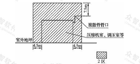建筑物內(nèi)部及建筑物外壁4.5m內(nèi),屋頂(以放散管管口計)以上7.5m內(nèi)的范圍為2區(qū)。