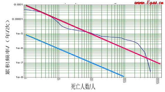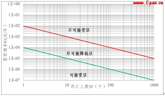 綜合考慮,我國采用香港地區(qū)的社會可接受風(fēng)險標(biāo)準(zhǔn)值,作為個人可接受風(fēng)險標(biāo)準(zhǔn)的補(bǔ)充對危險源造成群死群傷事故風(fēng)險的可接受程度進(jìn)行評估。