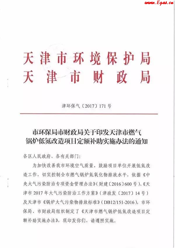 為加快改善我市環(huán)境空氣質(zhì)量,鼓勵(lì)項(xiàng)目單位開展低氮改造工作,切實(shí)控制全市燃?xì)忮仩t氮氧化物排放水平,市環(huán)保局、市財(cái)政局共同出臺(tái)了《天津市燃?xì)忮仩t低氮改造項(xiàng)目定額補(bǔ)助實(shí)施辦法》。自即日起,符合條件的燃?xì)忮仩t低氮改造項(xiàng)目單位可申請(qǐng)補(bǔ)助資金。