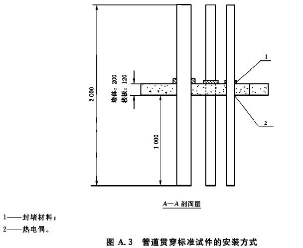 A.5 試驗時將管道封堵材料用金屬膨脹螺栓等金屬件固定在結(jié)構(gòu)厚度為120mm的現(xiàn)澆整體式C30砼樓板下(砼板受火面保護(hù)層厚度為10mm)或厚度為200mm砼墻體受火面一側(cè)。試驗用塑料管材總長度為2000mm,背火面塑料管材露出樓板或墻體長度為1000mm,受火面管口用同材質(zhì)堵頭或礦物棉封堵,封堵長度為(50±10)mm,背火面試驗管距管口50mm處用支承件固定。在背火面距樓板或墻體25mm處管外表面對稱兩側(cè)各安裝1支熱電偶。