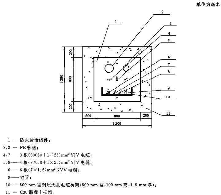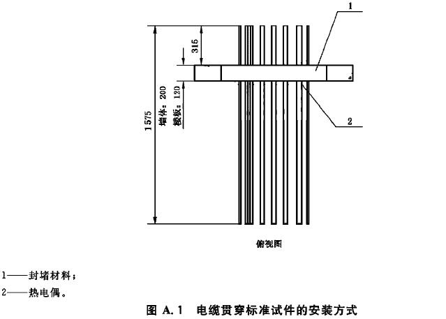 A.10 在電纜貫穿標(biāo)準(zhǔn)試件和防火封堵組件標(biāo)準(zhǔn)試件的防火封堵材料表面,距離每種貫穿物25mm處各布置一支熱電偶。在每種貫穿物表面距背火面25mm處布置一支熱電偶。當(dāng)貫穿物背火面作了絕熱處理或有涂層時,在貫穿物上距離絕熱層或涂層邊緣25mm處布置熱電偶。其他任何可疑點(diǎn)均可設(shè)置熱電偶。