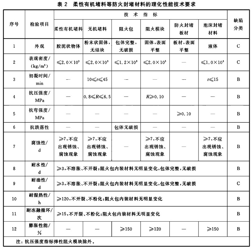 5.3.1  柔性有機堵料、無機堵料、阻火包、阻火模塊、防火封堵板材和泡沫封堵材料的理化性能應符合表2的規(guī)定。