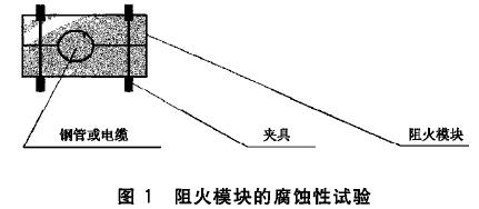 分別取長為250mm、外徑為Φ30mm~Φ40mm的Q235普通碳素結(jié)構(gòu)鋼管兩根和長為250mm、外徑為Φ30mm~Φ40mm的PVC絕緣護(hù)套電纜3根,在阻火模塊上鉆出與鋼管和電纜直徑相同的孔洞,并對剖。將鋼管和電纜置于阻火模塊的孔洞中,并用夾具固定,固定方式見圖1。七天后,觀察鋼管和電纜外層膠皮與堵料試樣接觸部位是否出現(xiàn)銹蝕、腐蝕現(xiàn)象。