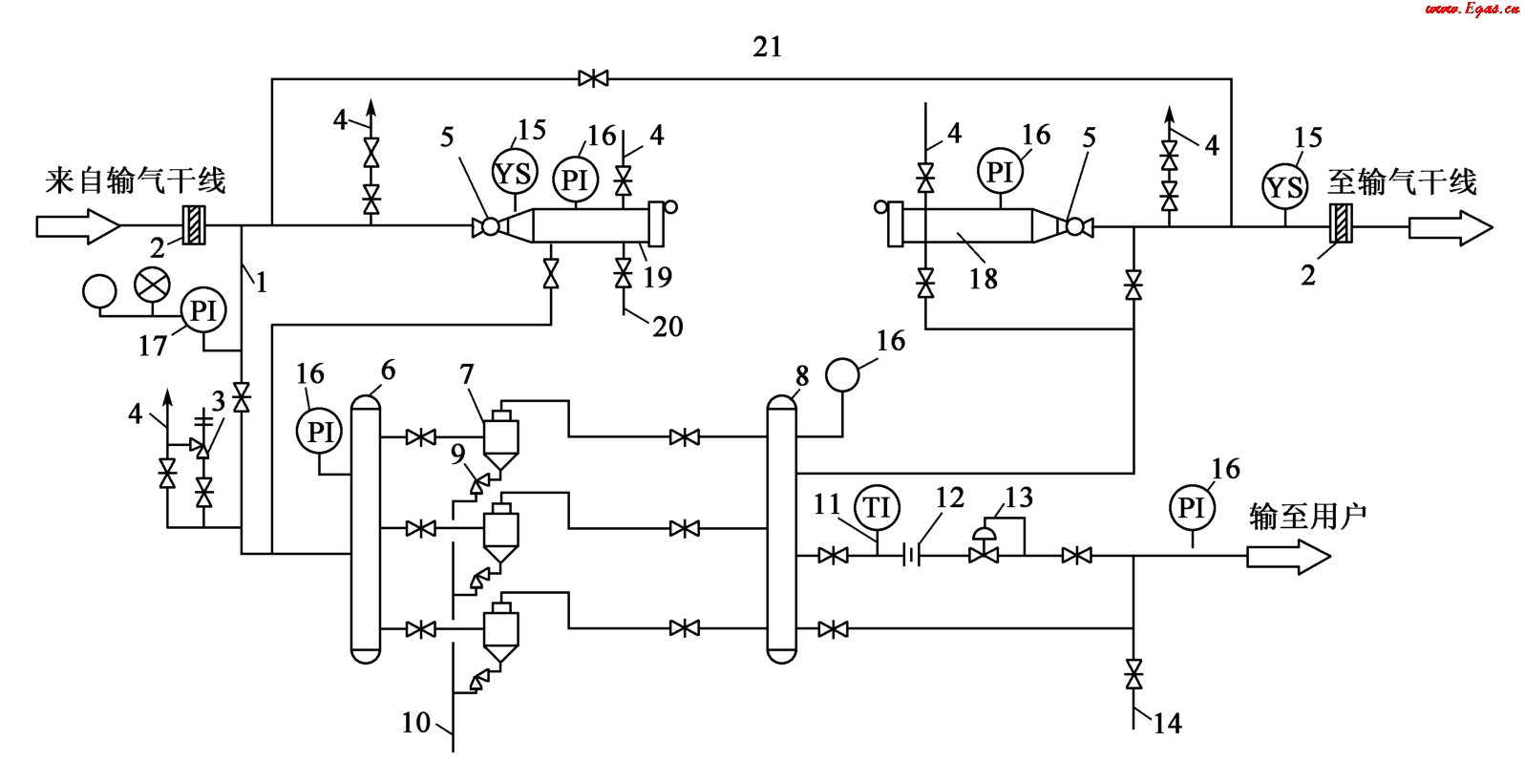 1—進(jìn)氣管;2—絕緣法蘭;3—安全閥;4,14—放空管;5—球閥;6,8—匯管;7—多管除塵器;9—節(jié)流閥;10—排污管;11—溫度計(jì);12—流量計(jì);13—調(diào)壓閥;15—清管器通過(guò)指示器;16—壓力表;17—電接點(diǎn)壓力表(帶聲光信號(hào));18—清管器發(fā)送裝置;19—清管器接收裝置;20—排污管;21—越站旁通管