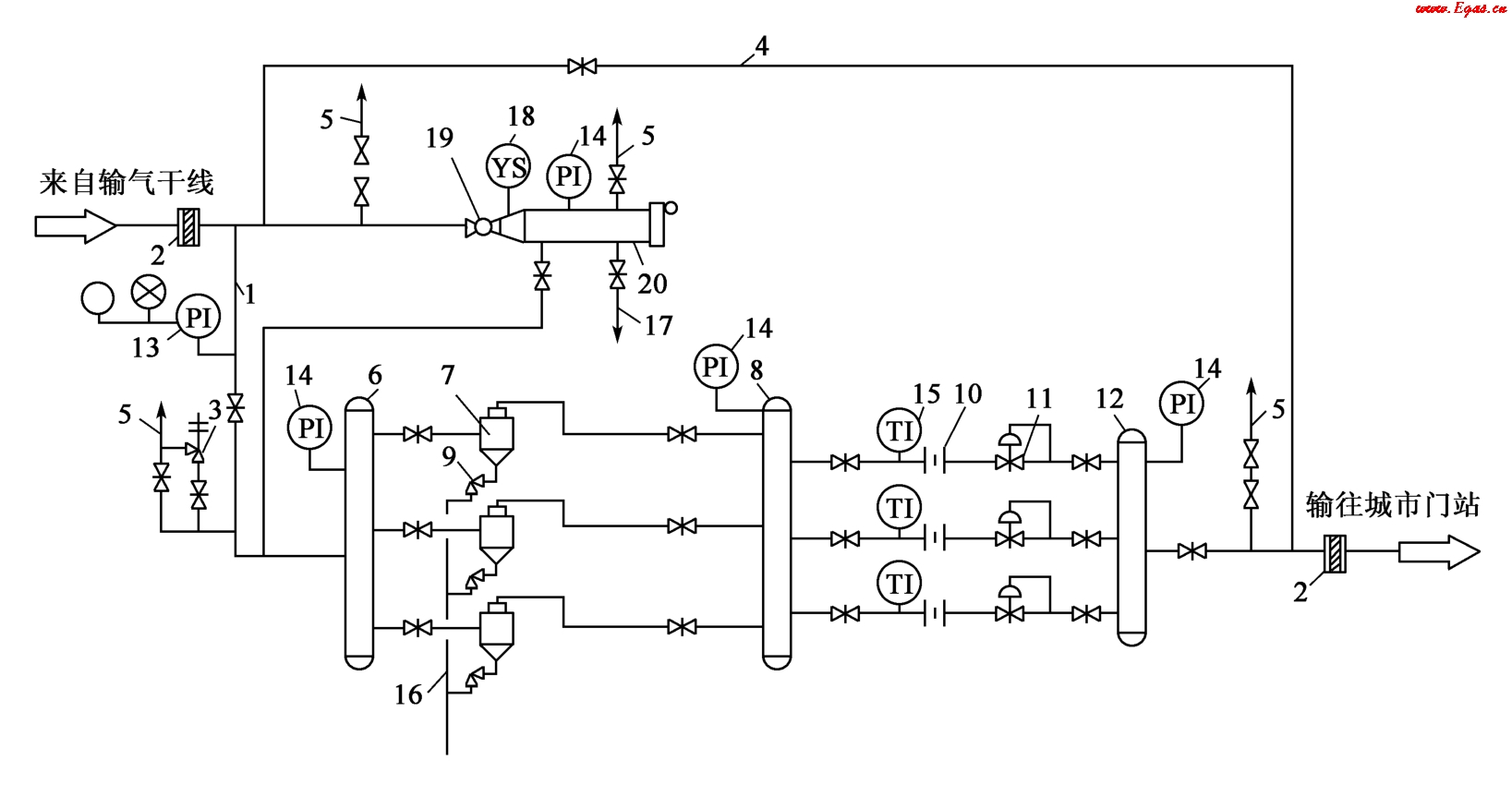 1—進(jìn)氣管;2,7—匯管;3—多管除塵器;4—溫度計(jì);5—流量計(jì);6—調(diào)壓閥;8—外輸氣管線;9—清管用旁通管;10—清管器發(fā)送裝置;11—放空管;12—球閥;13—清管器通過(guò)指示器;14—絕緣法蘭;15—電接點(diǎn)壓力表(帶聲光信號(hào));16—安全閥;17—壓力表;18—節(jié)流閥;19—排污管;20—越站旁通管