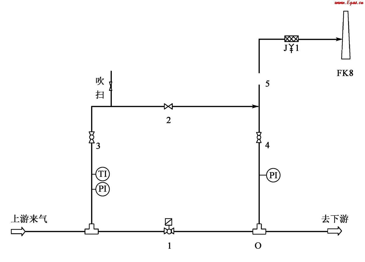閥室是輸氣干線中工藝比較簡單的設施,一般為無人值守。根據(jù)設計要求,在輸氣干線約20~30km范圍應設置閥室,在特殊情況下,如河流穿越處或地震斷裂帶兩側應分別設置閥室。典型的線路截斷閥室由緊急截斷閥和放空閥組成,其流程如圖3-11所示。