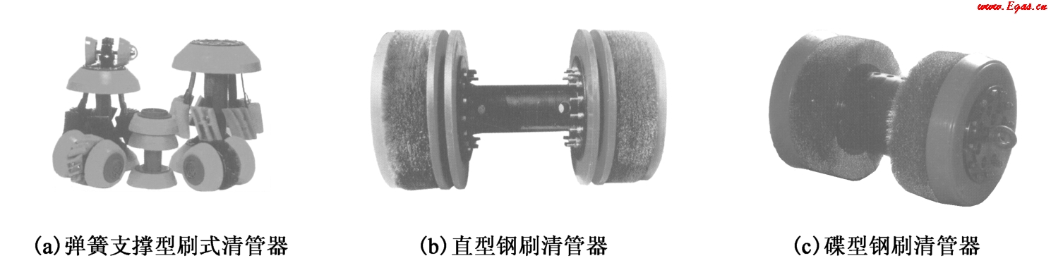 機(jī)械清管器是一種刮刷結(jié)合的清管器。機(jī)械清管器的皮碗略大于管內(nèi)徑,當(dāng)清管器隨介質(zhì)移動(dòng)時(shí),在皮碗和鋼刷的共同作用下,對(duì)于管內(nèi)附著力大、較硬的污物能起到很好的清掃作用,但對(duì)于有內(nèi)涂層的管道不能使用。