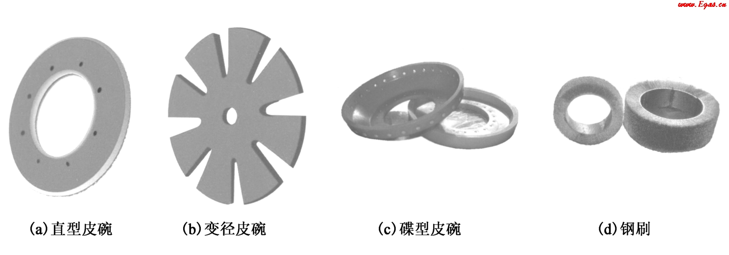 圖12-7為管道清管器用皮碗和鋼刷。直型皮碗主要用于雙向直型清管器中,皮碗的直徑大于管道的內(nèi)徑,靠彈性力保持清管器前后的密封,這種密封條件會(huì)很快地隨磨損而喪失,所以直型皮碗的使用壽命比碟型皮碗短。變徑皮碗實(shí)為直型皮碗的一種形式,主要用于變徑管道的清掃。碟型皮碗具有更好的密封性能,有深碟和淺碟之分,同時(shí)還可在皮碗上加鋼釘增加清掃效果。鋼刷應(yīng)可與皮碗進(jìn)行良好的互換,在管道清掃過程中,對(duì)管道的除銹、除垢具有良好的清掃效果。