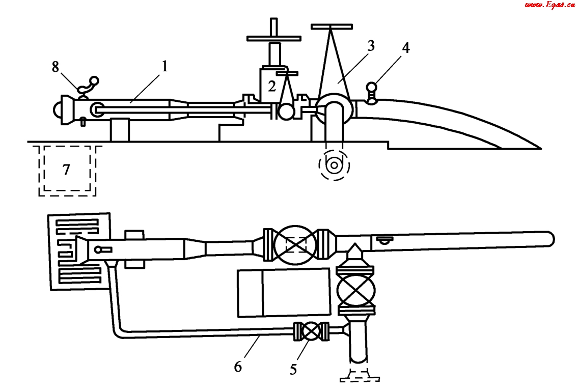1—發(fā)送筒;2—發(fā)送閥;3—線路主閥;4—通過指示器;5—平衡閥;6—平衡管;7—清洗坑;8—放空管和壓力表