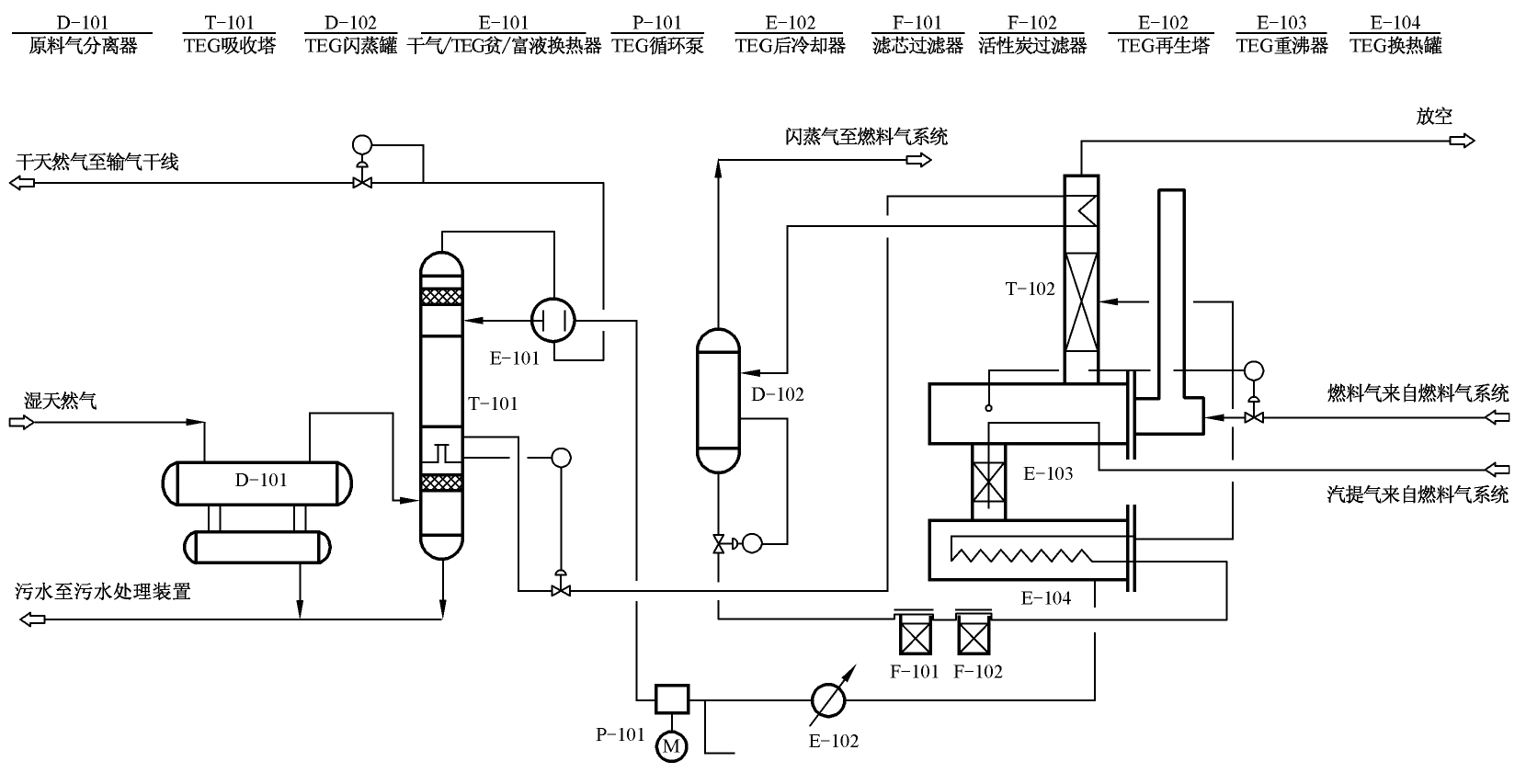 工藝過程的中心設(shè)備是吸收塔。用泵將TEG泵到吸收塔的頂部,TEG經(jīng)過吸收塔時與氣流逆流而向下流動,富TEG水溶液從塔底排出,再經(jīng)過冷凝器的盤管升溫并過濾后進(jìn)入閃蒸罐閃蒸,然后液相流入貧/富甘醇熱交換器,經(jīng)進(jìn)一步升溫并過濾后進(jìn)入脫水單元的再生器部分,在再生塔內(nèi)通過加熱使TEG吸收的水分在常壓下脫除;再生后的TEG經(jīng)貧/富甘醇熱交換器冷卻后,然后泵入吸收塔循環(huán)使用。而濕天然氣由吸收塔底進(jìn)入經(jīng)入口洗滌器后自下而上與TEG接觸傳質(zhì)后經(jīng)塔頂分離器后外輸。