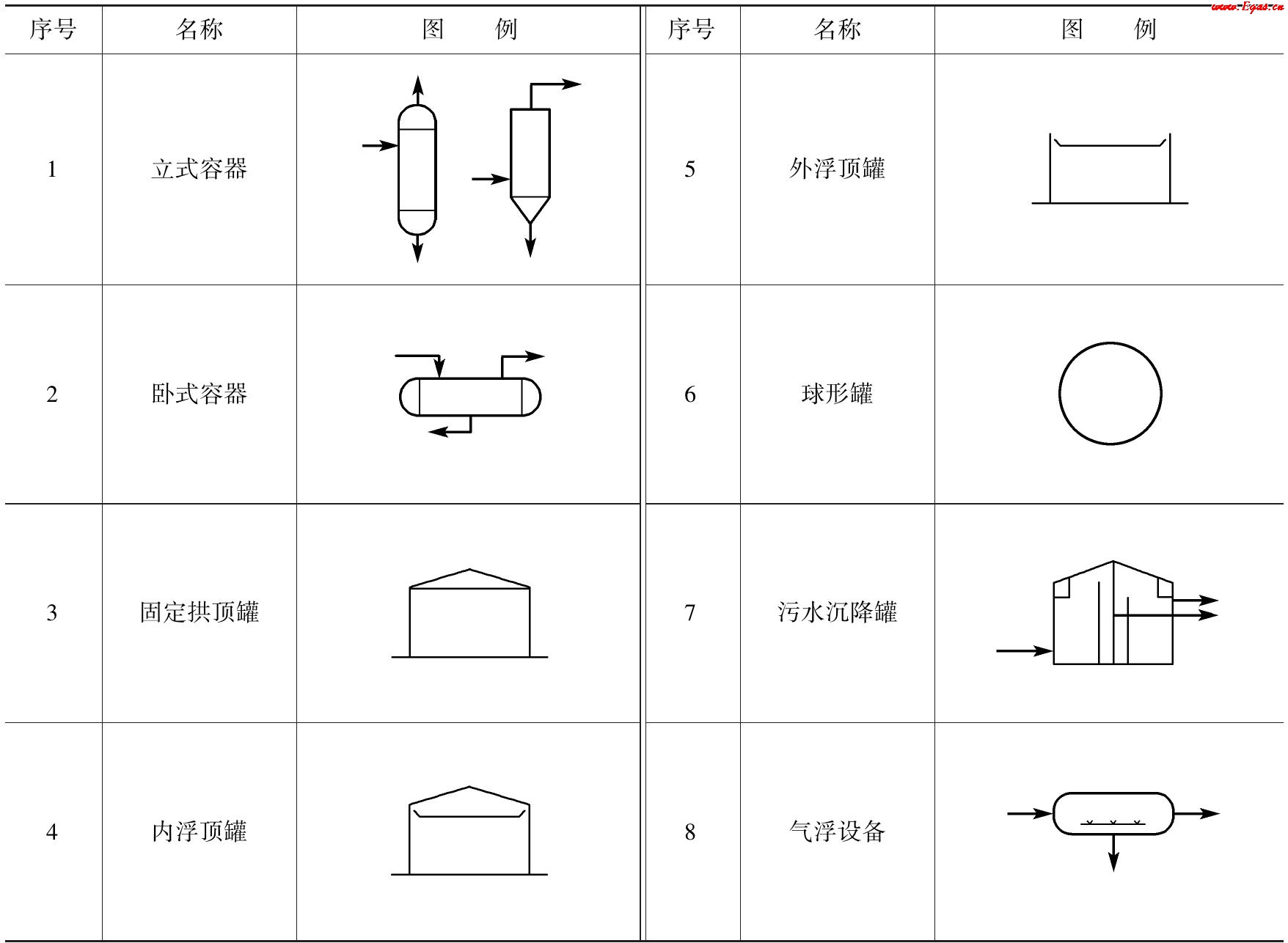 常見(jiàn)容器及儲(chǔ)罐的圖例見(jiàn)表3-1。