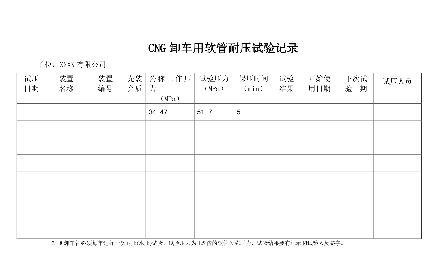 2、 卸車用軟管應(yīng)當每年進行一次耐壓試驗檢查, 試驗壓力為卸車用軟管公稱壓力的 1. 5 倍(液化天然氣卸車用管試驗壓力為 1. 2MPa);