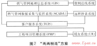 出于費(fèi)用方面的考慮,公司決定先進(jìn)行系統(tǒng)流程方面的整合,采用了“兩兩互連”的方案,后逐步進(jìn)行界面統(tǒng)一、數(shù)據(jù)挖掘和決策支持方面的整合。到目前為止,實(shí)現(xiàn)了燃?xì)夤芫W(wǎng)地理信息系統(tǒng)(GIS)與客戶服務(wù)系統(tǒng)(TCIS)、燃?xì)夤芫W(wǎng)地理信息系統(tǒng)(GIS)與管網(wǎng)巡線系統(tǒng)、工程項(xiàng)目管理系統(tǒng)(PMP)與用友系統(tǒng)(U8)的系統(tǒng)流程整合,實(shí)現(xiàn)了數(shù)據(jù)的互連互通,取得了良好的效果。在數(shù)據(jù)挖掘分析方面,目前正在加緊進(jìn)行仿真系統(tǒng)的引入。