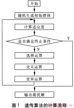 遺傳算法作為一種全局優(yōu)化搜索方法,以其簡單通用、魯棒性強、適于并行處理以及應(yīng)用范圍廣等特點,在求解復(fù)雜的工程優(yōu)化問題中取得了良好的效果。它是基于生物進(jìn)化的思想,將優(yōu)化計算中的迭代過程模擬成物種進(jìn)化的過程,形成一種具有“生成+檢驗”特征的搜索算法[5]。它以編碼空間代替問題的參數(shù)空間,以適應(yīng)度函數(shù)為評價依據(jù),以編碼群體為進(jìn)化基礎(chǔ),以對群體中個體位串的遺傳操作實現(xiàn)選擇和遺傳機(jī)制,建立起一個迭代過程,使遺傳算法具有了其他傳統(tǒng)優(yōu)化方法所沒有的特性。遺傳算法的計算流程見圖1。