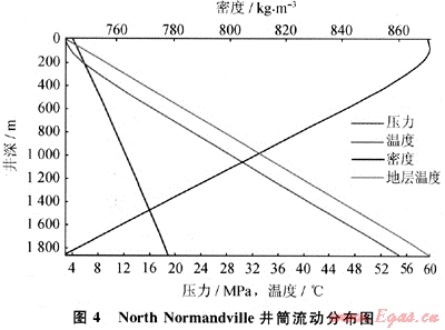 井筒的總傳熱系數(shù)為3W/m2·K,計(jì)算的井口壓力是4.19MPa和井底流體溫度55.3℃,與本文參考文獻(xiàn)E6]中所報(bào)告的4.38MPa非常吻合。圖4顯示了壓力、溫度和密度的分布。