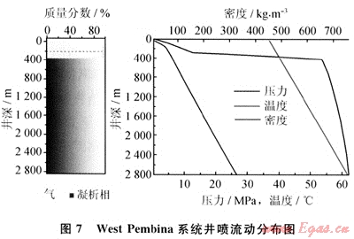 以上述West Pembina系統(tǒng)為例,如果流動(dòng)處于開(kāi)口狀態(tài),即井口壓力為101.325kPa,通過(guò)GLEWpro分析可知,該井噴流動(dòng)在井口達(dá)到臨界狀態(tài),其壓力為521kPa、速度為290m/s、流量為23.62×103m3/a,在300m深時(shí)流動(dòng)從液相轉(zhuǎn)變?yōu)闅庀?,如圖7所示。