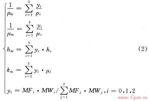 這些流體性質(zhì)計(jì)算關(guān)系式適用于氣體(y0=1.0)、液體(y0=0.0)和多相流(0.0<y0<1.0)。下標(biāo)i,j指流體的相態(tài),其中氣相為0,水相為1,凝析相(非水相液體)為2。