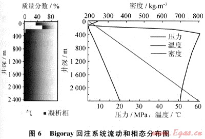 回注井深2396m,井筒為Ø60.325mm管,井底壓力和溫度是20.4MPa和61℃,要注入5℃的7.1×103m3/d的酸氣混合物(9.2%的H2S、89.8%的C02和1%的CH4)。GLEWpro估計(jì)的回注壓力是3.91MPa,與本文參考文獻(xiàn)[7]所報(bào)告的4.056MPa非常接近。本文參考文獻(xiàn)[7]指出在距井口239.4m左右流體從多相轉(zhuǎn)變?yōu)橥耆合?,GLEWpro顯示這個(gè)轉(zhuǎn)變發(fā)生在250m處,流動(dòng)和相態(tài)分布見(jiàn)圖6。