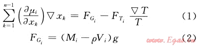 μi為化學(xué)勢(shì),J/mol;xi為摩爾分?jǐn)?shù);無(wú)因次;Vi為偏摩爾體積,m3/mol;Mi為組分i的摩爾質(zhì)量;g/mol;ρ為流體密度,kg/m3;Mi為i組分的重力項(xiàng);FTi為i組分的熱擴(kuò)散項(xiàng);Mi為組分i的分子量;無(wú)因次;Mm為混合物的分子量;無(wú)因次;Vi為i組分的偏摩爾體積,m3/mol;Vm為混合物的摩爾體積,m3/mol;Hi為i組分的偏摩爾焓,kJ/mol;Hm為混合物的焓,kJ;fi為i組分的逸度,Pa;h為深度,m;h0為參考深度,m;n為摩爾數(shù),無(wú)因次。