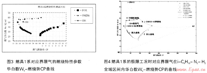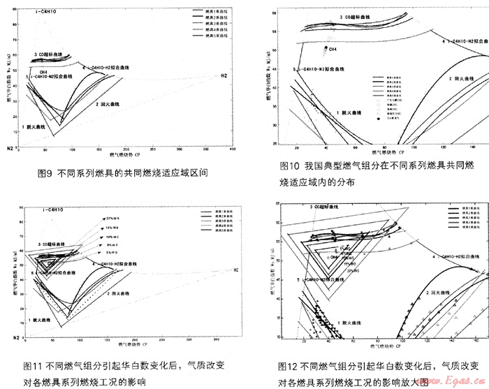 如前述圖3~8所示,以燃?xì)馊A白數(shù)顫、燃?xì)馊紵齽軨P兩個參數(shù),建立的坐標(biāo)圖形,可以得到比較平滑的脫火、回火及CO超標(biāo)等極限燃燒特性曲線,并可形成比較穩(wěn)定的燃?xì)饩哌m應(yīng)性封閉區(qū)域。
