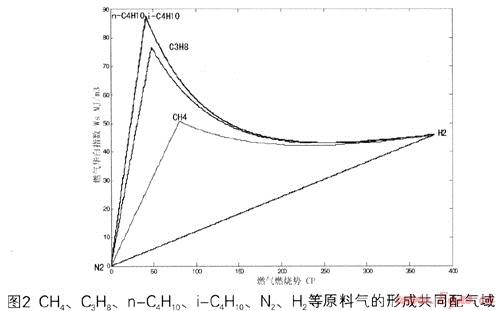 由圖2可以看出:以CH4、H2、N2三組分,C3H8、H2、N2三組分,n-C4H10、H2、N2三組分,i-C4H10、H2、N2三組分等形成的各配氣區(qū)間和共同配氣域,其邊界線并不都是直線形式。各原料氣形成的配氣邊界線中,任兩組可燃?xì)怏w形成的配氣邊界線為指數(shù)曲線形式;而N2與H2、N2與另一可燃?xì)怏w形成的配氣邊界線為直線形式。