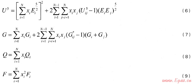 式(5)中的U,G,Q,F(xiàn)只與天然氣的組成有關(guān),按式(6)~(9)計算: