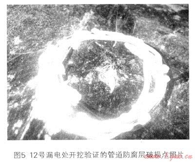 第二外加電流處,極化后,通電電位Von=-1560mV,斷電電位Voff=-1010mV,管道到遠大地點的電位差為VT=550mV,犧牲陽極上形成的電位差VTC為60mV,9~12處漏電點由2號測試樁提供的信號檢出,由表中數(shù)據(jù)可以看出,9號點檢測到的犧牲陽極旁的土壤距遠方大地的電位差Vs與犧牲陽極上形成的電位差VTC基本相當,初步判斷為犧牲陽極,隨后的開挖驗證證實了此判斷。9、10、12號漏電點的IRC已經(jīng)大于100%,所以判斷這些點連接有犧牲陽極,但不排出伴隨有防腐層破壞。其中12號漏電點的IRC已經(jīng)高達163%,伴隨有管道防腐層破壞的可能性很大。恰好此處具備開挖條件。開挖后發(fā)線該處有犧牲陽極,同時伴隨有管道防腐層破壞,如圖5所示。另外,此12處漏電點相隔距離基本上是相隔200~400m,這也符合一般犧牲陽極埋設(shè)距離,能夠為陽極信號干擾排除提供依據(jù)。
