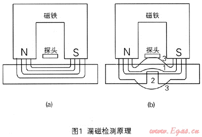 漏磁檢測(cè)[1、6]是通過(guò)測(cè)量被磁化的鐵磁材料工件表面泄漏的磁場(chǎng)強(qiáng)度來(lái)判斷工件缺陷大小的,原理如圖1所示: