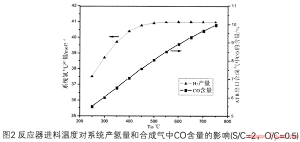 SIC=2,O/C=0.5時,進料溫度對氫氣產量及合成氣中CO含量的影響如圖4所示。隨著進料溫度Tin的增大,蒸汽重整反應的平衡轉化率提高,系統(tǒng)產氫量有所增加,但是同時,也產生了更多的CO,這樣就會增加下游合成氣凈化系統(tǒng)的負荷。當Tin<500℃時,隨著Tin的增大,氫氣產量增加的幅度較大,當Tin>500℃時,氫氣產量的增加趨勢趨于平緩:ATR出口混合氣中CO的含量與Tin基本呈線性增加。對于整個系統(tǒng)而言,隨著Tin的增大,系統(tǒng)的能耗也將增大(燃燒的天然氣增多)。從圖2可以確定,在所研究的操作條件下,Tin較為合理的范圍是450~500℃。