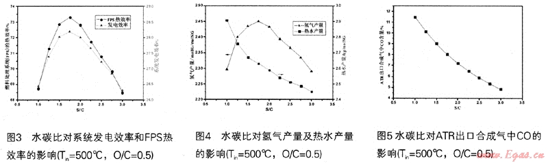 對于整個系統(tǒng)來說,水碳比是重要的操作參數,對系統(tǒng)的效率會產生重要的影響。高水碳比可以防止重整催化劑上積碳的產生,有利于重整反應向產物方向進行,從而提高氫氣的產率,但是高水碳比會導致整個系統(tǒng)的能耗較大,需要很多額外的能量來產生高溫蒸汽,因而可能會降低燃料處理系統(tǒng)的熱效率。所以要從系統(tǒng)效率的角度去考慮合適的水碳比。圖3-5顯示了自熱重整進料溫度為500℃,氧碳比為O.5時,水碳比對發(fā)電效率、燃料處理系統(tǒng)(FPS)熱效率,氫氣產量(molH2/molNG)、系統(tǒng)熱水產量(kg/molNG)DATR出口合成氣中CO含量的影響。