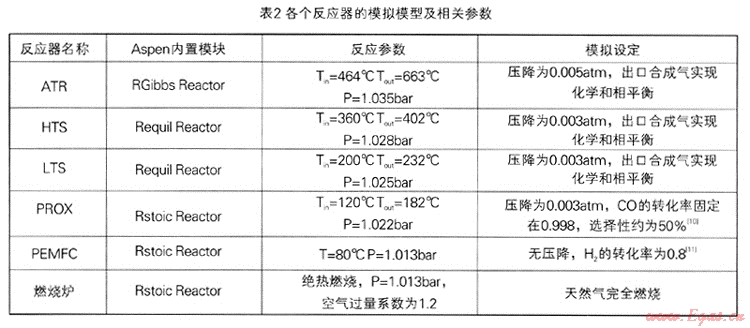ATR,HTS,LTS和PROX反應器在模擬過程中處理為絕熱系統(tǒng),ATR,HTS,LTS反應器出口的合成氣處于出口溫度下的化學平衡狀態(tài),出口溫度由入口物流溫度及絕熱溫升決定。表2列舉了各個反應器在模擬過程中Aspen內置的模塊及相關的參數。